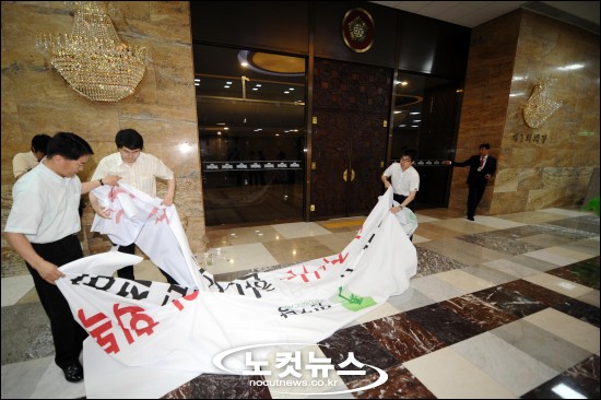 민주당은 이날 오후 예정된 아시아태평양 의회 사무총장 포럼 참석차 방한한 33개국 의회 사무총장 40여명이 국회 본회의장 전자의회 시스템 관람을 위해 로텐더홀을 비워달라는 국회사무처의 요청을 받아들여 본회의장 입구에 깔아놓은 돗자리와 현수막 등을 걷어냈다.