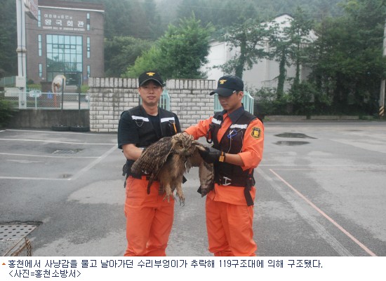 전선에 걸려 추락한 수리부엉이가 119구조대에 의해 구조돼 강원대 야생동물구조센터로 옮겨졌다.