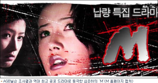 시청률 조사회사 AGB 닐슨이 지난 1992년부터 현재까지 방영한 공포물 시청률을 조사한 결과에 따르면, 1994년 방송된 심은하 주연의 MBC미니시리즈 'M'이 38.6%의 시청률로 1위를 차지한 것으로 나타났다.