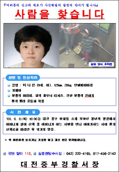 이 양은 지난 3일 오전 10시 30분쯤 대전 중구 문화동 소재 보문산 아래 사정공원에서 어머니와 함께 산책을 하다 어머니가 아는 사람과 이야기를 하는 도중 실종돼 경찰이 지난 4일부터 공개수사를 벌여왔다.
