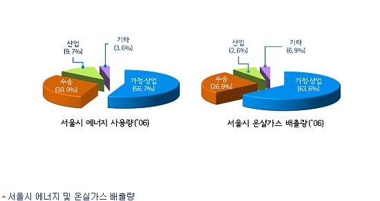 한편 서울에서 배출되는 온실가스 양은 2006년 기준 4천 5백만톤 CO₂으로 우리나라 전체 배출량의 7.5%이며 이 가운데 가정과 공공건물에서 배출되는 양이 63%를 차지하고 있다.
