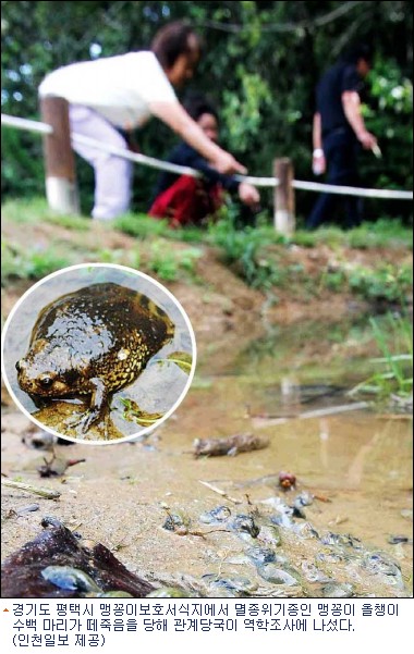 경기도 평택시 비전동 맹꽁이보호서식지에서 멸종위기종인 맹꽁이 올챙이 수백 마리가 떼죽음을 당해 관계당국이 역학조사에 나섰다.