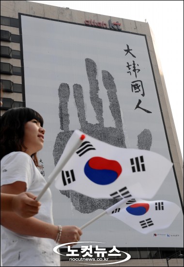 가로30미터, 세로 50미터인 걸개그림은 지난 6월부터 서울 및 전국 광역시와 마라도 독도 등 국내와 미국 뉴욕, 중국 하얼빈 등을 다니며 국민들의 작은 손도장 3만2천여개를 모아 완성한 '안중근 손도장 재현그림'으로 서경덕 성신여대 객원교수의 기획아래 대학생 문화연합동아리 '생존경쟁'이 참여해 문화체육관광부와 국가보훈처의 후원으로 완성됐으며 다음달 8일까지 광화문 KT건물에서 전시된다.