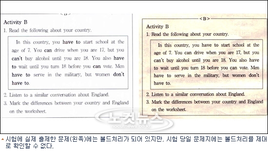 그런데 평가원 홈페이지에 올라온 시험지와 직접 시험을 본 미색종이 시험지를 대조한 결과, 종이시험지와는 달리 인터넷상에는 지문의 몇몇 단어가 뚜렷하고 굵은 글씨체로 입력이 돼 있었다.