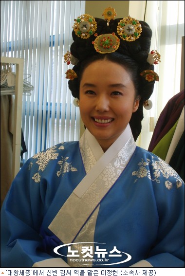 [BestNocut_R]이정현은 3월 중순 방송되는 ''대왕세종'' 20회에 첫 등장, 세종(김상경 분)과 아슬아슬한 사랑을 보여주는 신빈 김씨 역을 맡았다. 신빈 김씨는 세종의 후궁으로 조선시대 최고의 신데렐라로 평가받는 인물. 세종의 중전 소헌왕후 심씨(이윤지 분)의 궁녀로 발탁됐다가 세종과 사랑에 빠지는 매력적인 캐릭터로 이윤지와의 대결도 기대를 모은다.
