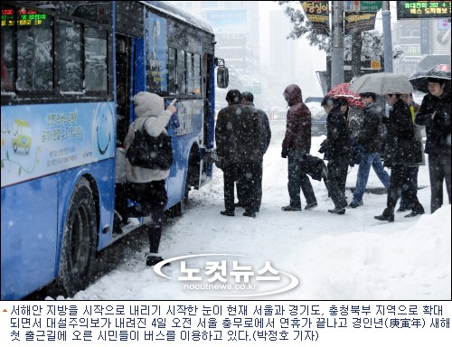 2010년 새해 첫 출근길을 덮친 폭설로 지하철과 버스 등 대중교통 운행에도 차질이 빚어지면서 출근길 시민들이 큰 불편을 겪고 있다.