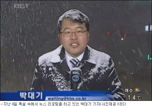 지난 4일 폭설 속에서 눈을 맞으며 뉴스 리포팅을 해 일명 ‘눈사람 기자’라는 애칭을 얻은 KBS 박대기 기자에게 하루에 1,000여 통이 넘는 격려 메일이 쏟아진 것으로 알려졌다.