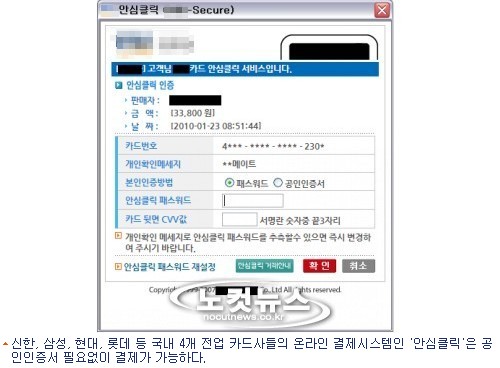 25일 금융권에 따르면 신한, 삼성, 현대, 롯데 등 국내 4개 전업 카드사들의 온라인 결제시스템인 '안심클릭'은 공인인증서 필요없이 결제가 가능하다.