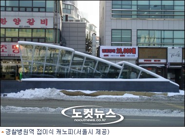 경찰병원역 한개 출입구에는 평상시 지붕이 열려 있다가 눈이나 비가 올때 계단 미끄럼 방지를 위해 자동으로 시설물을 가리는 접이식 캐노피가 설치됐다.[BestNocut_R]