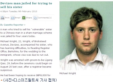 영국 잉글랜드 남부 버크셔 리딩 지역의 한 패스트푸드점에서 일을 하던 마이클 라이트(22)는 이 곳에서 함께 일하던 중국인들과 짜고 지난 2008년 5월 위장결혼을 했다. 4천파운드(약 700만원)를 받고 중국인 여성 리 판(33)이 합법적으로 영국에 살 수 있도록 도운 것.