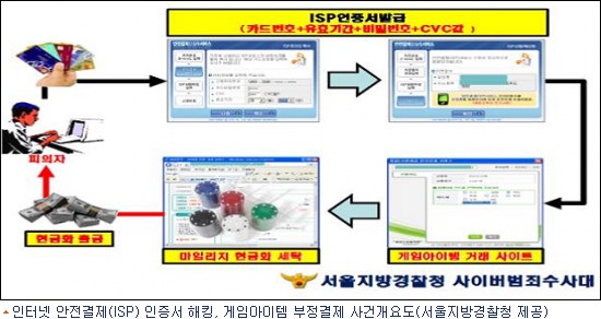 경찰은 이같은 ISP 인증서 발급 방식과 게임아이템 거래 사이트의 허점을 노려 신용카드 정보를 빼돌린 뒤 부정사용하는 사례가 더 있을 것으로 보고 수사를 계속하고 있다.
