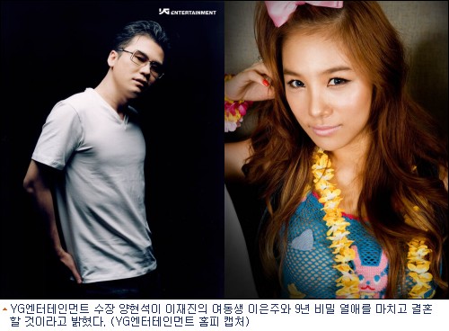 YG엔터테인먼트의 수장 양현석 대표가 그룹 젝스키스 출신 이재진의 여동생 이은주와 9년 동안 비밀열애를 했다고 발표했다.