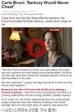 10일 영국 매체 스카이뉴스닷컴은 지난주 브루니와 가진 인터뷰 중 그녀가 남편 니콜라 사르코지(55) 프랑스 대통령은 절대 바람을 피우지 않을 것이라고 답했다고 전했다.