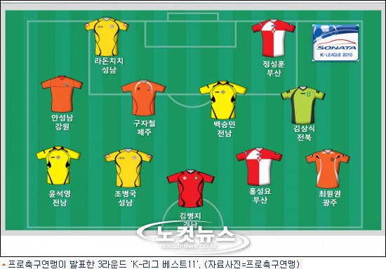 프로축구연맹은 15일 기술위원회의 선수 평점 및 평가로 선정되는 'K-리그 베스트11'을 발표했다. 또 3라운드 베스트 팀으로는 성남이, 베스트 매치로는 경남과 제주의 경기가 선정됐다.