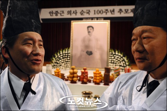 안중근 의사 순국 100주년을 하루 앞둔 25일 오후 서울 효창동 백범기념관 대강당에서 광복회(회장 김영일) 주관으로 열린 추모제향에 유족대표로 참석한 안 의사의 증손자 토니 안씨(왼쪽)와 백범 김구 선생의 손자인 김양 국가보훈처장이 대화를 하고 있다.