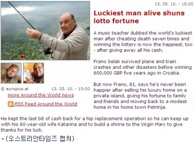 크로아티아의 음악 교사 프라노 셀락(81)은 지금까지 7번이나 죽음의 사고 현장에서 목숨을 구했으며, 5년전에는 60만 파운드(약 10억원) 상당의 복권까지 당첨됐다.
