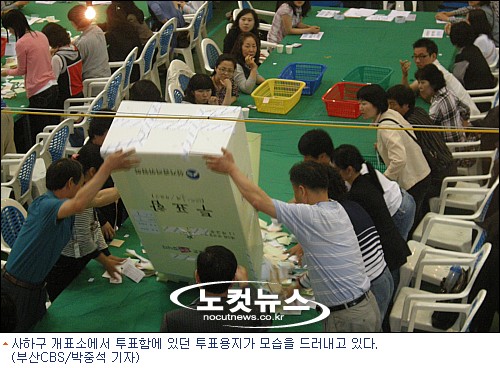 사하구 동주대 체육관에 마련된 사하구 개표소에는 오후 6시 45분 첫 투표함의 뚜껑이 열린 이후 본격적인 개표 작업이 이루어지고 있으며, 사하구 일대 79개 투표소에서 보내온 158개의 투표함들도 속속 도착하고 있다.