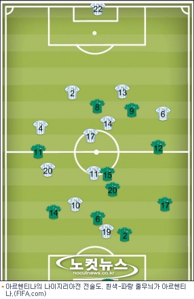 일단 아르헨티나 공격은 메시, 테베스, 이과인 삼각편대가 이끈다. 이과인을 중심으로 양 옆에 메시와 테베스가 서는 공격 포진이다. 특히 메시와 테베스는 포지션에 구애받지 않고 구석구석을 누비며 찬스를 만들어낸다.