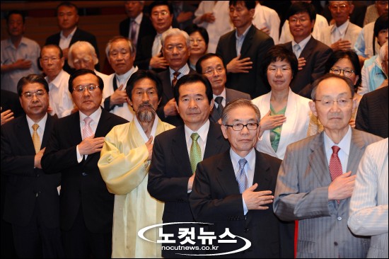 15일 오전 서울 견지동 한국불교역사문화기념관에서 열린 6.15공동선언발표 10주년기념 평화통일민족대회에서 참석자들이 국민의례를 하고 있다. 앞줄 오른쪽부터 6.15공동선언실천남측위원회 백낙청 명예대표, 김상근 상임대표, 민주당 정세균 대표, 민주노동당 강기갑 대표, 창조한국당 송영오 대표, 국민참여당 이재정 대표.