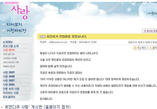 ‘크리스마스의 기적’ 제작진은 21일 오후 프로그램 홈페이지를 통해 이같은 사실을 고지했다. 제작진은 “방송이 나간 뒤 지운이의 친엄마라는 분이 나타나셨고 오늘 오전 확인 결과 생모임이 확인돼 (지운이가) 엄마와 함께 살게 됐다”라고 밝혔다.