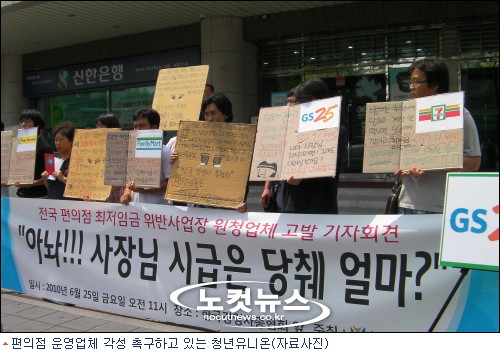 국내 첫 세대별 노동조합인 청년유니온은 25일 오전 서울 마포구 대흥동 한국경영자총협회 앞에서 기자회견을 열어 최저임금법을 준수하지 않고 있는 편의점 운영업체들의 각성을 촉구했다.