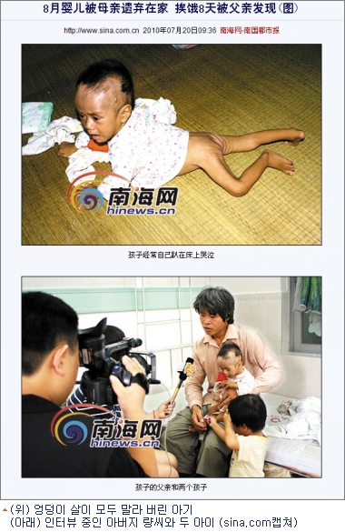 20일 중국 신화통신(sina.com)에 따르면 중국 하이코우(海口)시 신포(新坡)읍 바오리(保礼)촌에서 출생한지 8개월 된 영아가 친모에게 버려져 집에서 약 8일 동안 아무것도 먹지 못하는 일이 발생했다.