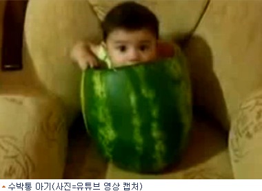 검은 머리카락과 동그란 눈, 이목구비 등으로 미루어 중동 지역 출신으로 추정되는 한 아기가 소파 위에 놓인 커다란 수박통 속에 들어가 가녀린 팔로 수박통을 붙잡고 연신 껍질을 빨려고 하는 깜찍한 모습이 누리꾼들과 외신들의 눈길을 끌고 있는 것.