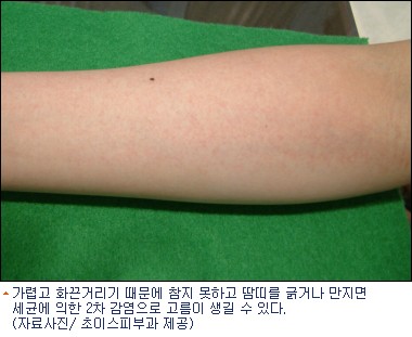 땀띠가 붉은 색으로 변하면 가렵고 화끈거리기 때문에 참지 못하고 긁거나 만지게 되는데 세균이 감염돼 땀띠가 난 부위에 고름이 생길 수 있다.