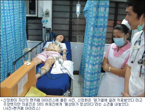 9일 오후 방송된 SBS ‘한밤의 TV연예’에 따르면 신정환이 입원한 세부닥터스호스피탈 의료진은 취재진에게 “(신정환의) 몸상태가 정상이다”라는 소견을 내놓았다.