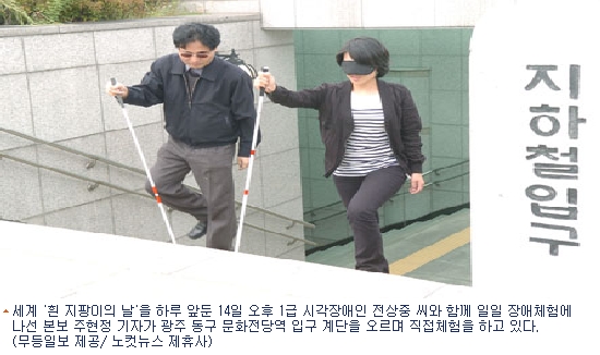 '흰 지팡이의 날'을 하루 앞둔 14일 오후. 전씨와 함께 흰 지팡이와 안대를 쓰고 광주 동구 서석동 동구청사 앞에서 문화전당 지하철역을 찾아가기로 했다.
