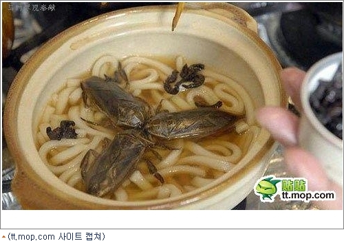 중국의 한 네티즌이 게재한 사진이 중국 현지 온라인에서 화제가 되고 있다. 엄지 손가락 만한 곤충 세 마리가 들어간 면요리 사진을 공개한 것.