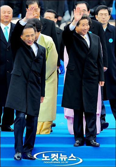 [BestNocut_R]이명박 신임 대통령과 노무현 전임 대통령이 25일 오전 서울 여의도 국회의사당 앞 광장에서 열린 제 17대 대통령 취임식을 마친 뒤 연단을 내려오며 군중의 환호에 답하고 있다.