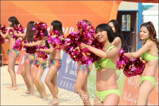 광저우 아시안게임이 열리고 있는 15일 오전 중국 광저우 비치발리볼 경기장에서 치어리더들이 열띤 응원을 펼치고 있다.