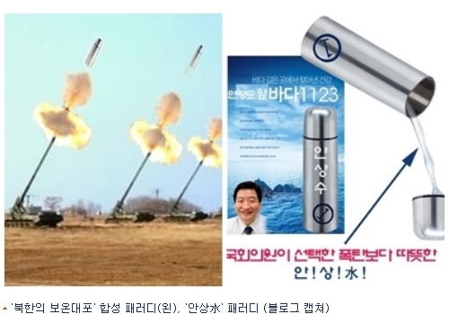 대포에 보온병을 포탄으로 장착해 발사하는 '북한의 보온대포' 합성 패러디에 이어, 안상수 대표의 이름을 '안상水'로 바꾸고 '국회의원이 선택한 폭탄보다 따뜻한 안상水'라는 구호를 붙인 광고 포스터가 제작돼 각종 블로그와 게시판에 퍼 날라지고 있다.