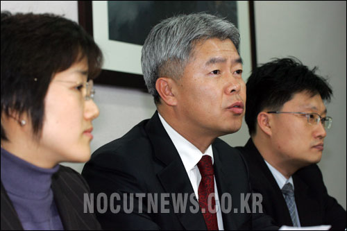 26일 저녁 7시30분 서울 강남구 역삼동 법무법인 한결 회의장에서 열린 ''연예인 허위 신상정보 유출사태 대책위원회'' 소속 변호사 3차 기자회견에서 김응조 변호사(가운데)가 인터뷰를 하고 있다. (한대욱기자/노컷뉴스)