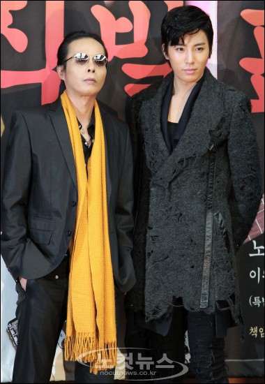 KBS 드라마스페셜 4부작 연작드라마 '락락락(락 Rock 樂)'(극본 박경선 방효금, 연출 이원익)의 제작발표회가 8일 오후 서울 여의도 KBS 국제회의장에서 열린 가운데 극중 김태원 역을 맡은 노민우(오른쪽)와 김태원이 포즈를 취하고 있다.