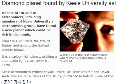 코엘 헬리어 킬 대학 천문학교수와 피에르 막스테드 박사, 데이비드 앤더슨 등이 함께 발표한 이 연구결과에 따르면 지구에서 1천200광년 떨어진 곳에 위치한 행성 'Wasp 12b'는 탄소가 고밀도로 집중돼 있다. 이런 구성의 행성은 최초로 발견된 것으로 알려졌다.