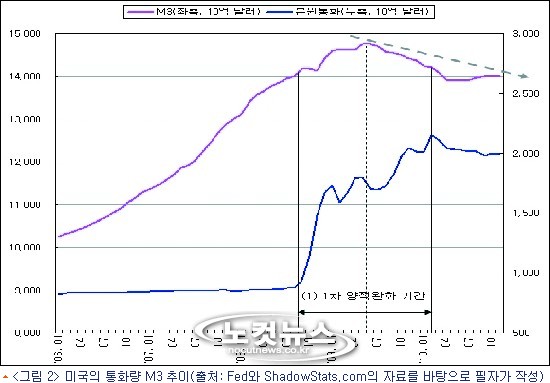 하지만 <그림 2>을 보면 Fed의 본원통화 공급에도 불구하고 미국의 달러화 통화량 M3는 증가하고 있지 않습니다. 그러므로 그와 같은 주장은 거짓말입니다.