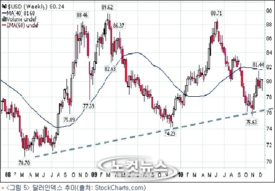 ▶ 원.달러 환율의 변화에 대해 많은 분들이 관심을 가지고 있습니다. 앞으로 달러화는 어떤 행보를 보일 것으로 예상하십니까? 아울러 금이나 각종 원자재의 행보에 대한 견해도 여쭙고 싶습니다.= Fed의 양적완화정책으로 인해 말들이 많습니다만, <그림 5>에서 회색 화살표가 제시하고 있듯이 1차와 2차 양적완화정책이 불러일으킨 요란한 논란에도 불구하고 달러의 가치에 대한 시장의 평가를 보여주는 달러인덱스는 상승추세에 놓여있다는 사실을 주목해야 합니다.