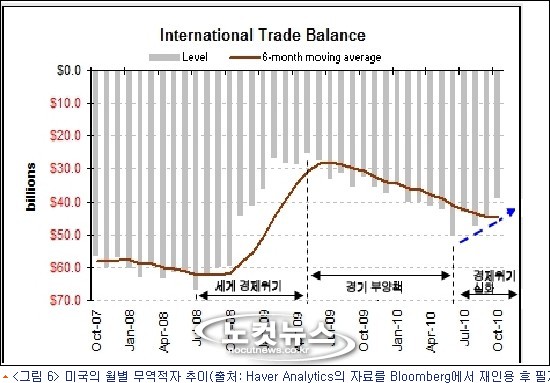 그런데 그 때부터는 달러인덱스가 되려 상승하고 있습니다. 이처럼 꾸준히 상승하고 있는 이유는, <그림 2>에서 보았듯이 신용경색의 결과 달러화 통화량이 줄어들고 있기 때문입니다. 또한 <그림 6>에서 보듯이 미국의 무역적자가 줄어들고 있기 때문이기도 합니다.