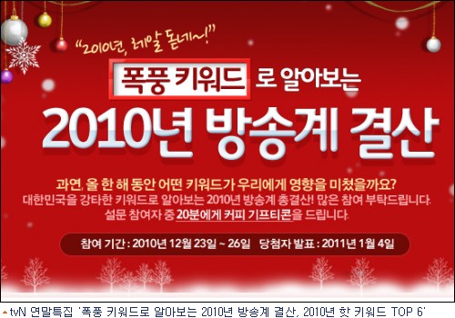 한편, 종합오락채널 tvN에서는 연말연시를 맞아 '폭풍 키워드로 알아보는 2010년 방송계 결산, 2010년 핫 키워드 TOP 6'를 특집 편성한다.