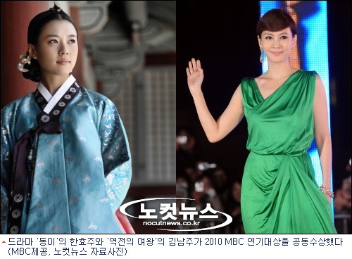 결국 ‘여왕’들이 일을 냈다. MBC 드라마 ‘동이’의 숙빈 최씨 한효주와 드라마 ‘역전의 여왕’의 김남주가 2010 MBC연기대상을 공동수상했다.