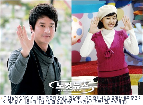 내년 3월 말 한쌍의 연예인-아나운서 커플이 탄생할 전망이다. 최근 열애사실을 공개한 배우 정준호(41)와 MBC 이하정(33) 아나운서가 구체적인 결혼시기를 밝혔다.