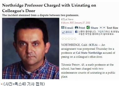 미국 캘리포니아 주립 대학 노스리지 캠퍼스 수학 교수 티호미르 페트로브(43)는 논쟁을 벌인 동료 수학교수 사무실 문에 소변을 본 혐의로 기소됐다고 27일 미국 매체 폭스40 등 외신들이 전했다.