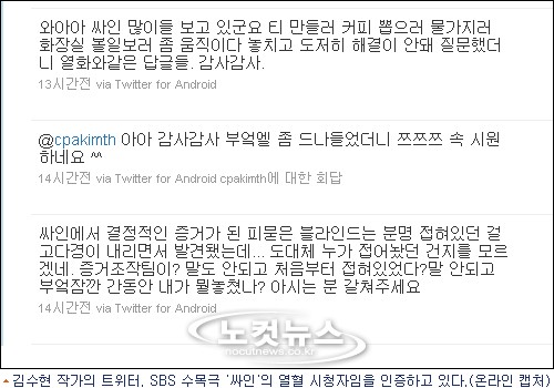 김 작가는 자신의 트위터(http://twitter.com/Kshyun)를 통해 “‘싸인’에서 결정적인 증거가 된 피묻은 블라인드는 분명 접혀있던 걸 고다경이 내리면서 발견됐는데...도대체 누가 접어놨던 건지를 모르겠네. 증거조작팀이? 처음부터 접혀있었다? 부엌잠깐 간 동안 내가 뭘 놓쳤나? 아시는 분 가르쳐 주세요”라는 글을 올렸다.