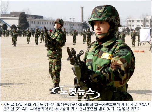 자신의 몸보다 더 큰 군장을 메고 무거운 철모를 눌러 쓴 여대생의 입에서 나온 말이다. 국내 첫 여성 ROTC로 뽑힌 민지현 후보생(21세, 숙명여대 수학통계학과), 3주간의 기초군사훈련을 마치고 돌아온 그녀에게서 풋풋한 여대생이 아닌 강인한 여군의 이미지가 느껴진다.
