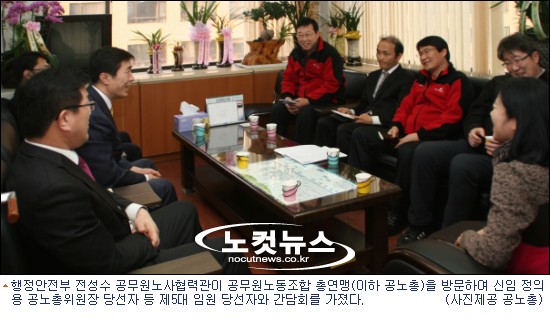 행정안전부 전성수 신임 공무원노사협력관이 공무원노동조합 총연맹(이하 공노총)을 방문하여 신임 정의용 공노총위원장 당선자 등 제5대 임원 당선자와 간담회를 가졌다.