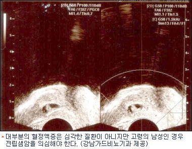 전립샘초음파 검사에서 전립샘 내부에 낭종이 있었고 내부에 난 혹에서 혈관이 터져 출혈이 되고 있는 것을 발견했다.