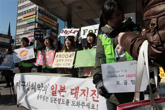 일본 대지진 발생 1주일이 지난 17일 오전 서울 명동 거리에서 국제구호NGO 굿네이버스 인하대 자원봉사 동아리 '인하브로드' 학생들이 일본 이재민을 돕기 위한 홍보와 모금활동을 벌이고 있다.