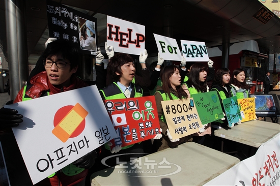 일본 대지진 발생 1주일이 지난 17일 오전 서울 명동 거리에서 국제구호NGO 굿네이버스 인하대 자원봉사 동아리 '인하브로드' 학생들이 일본 이재민을 돕기 위한 홍보와 모금활동을 벌이고 있다.